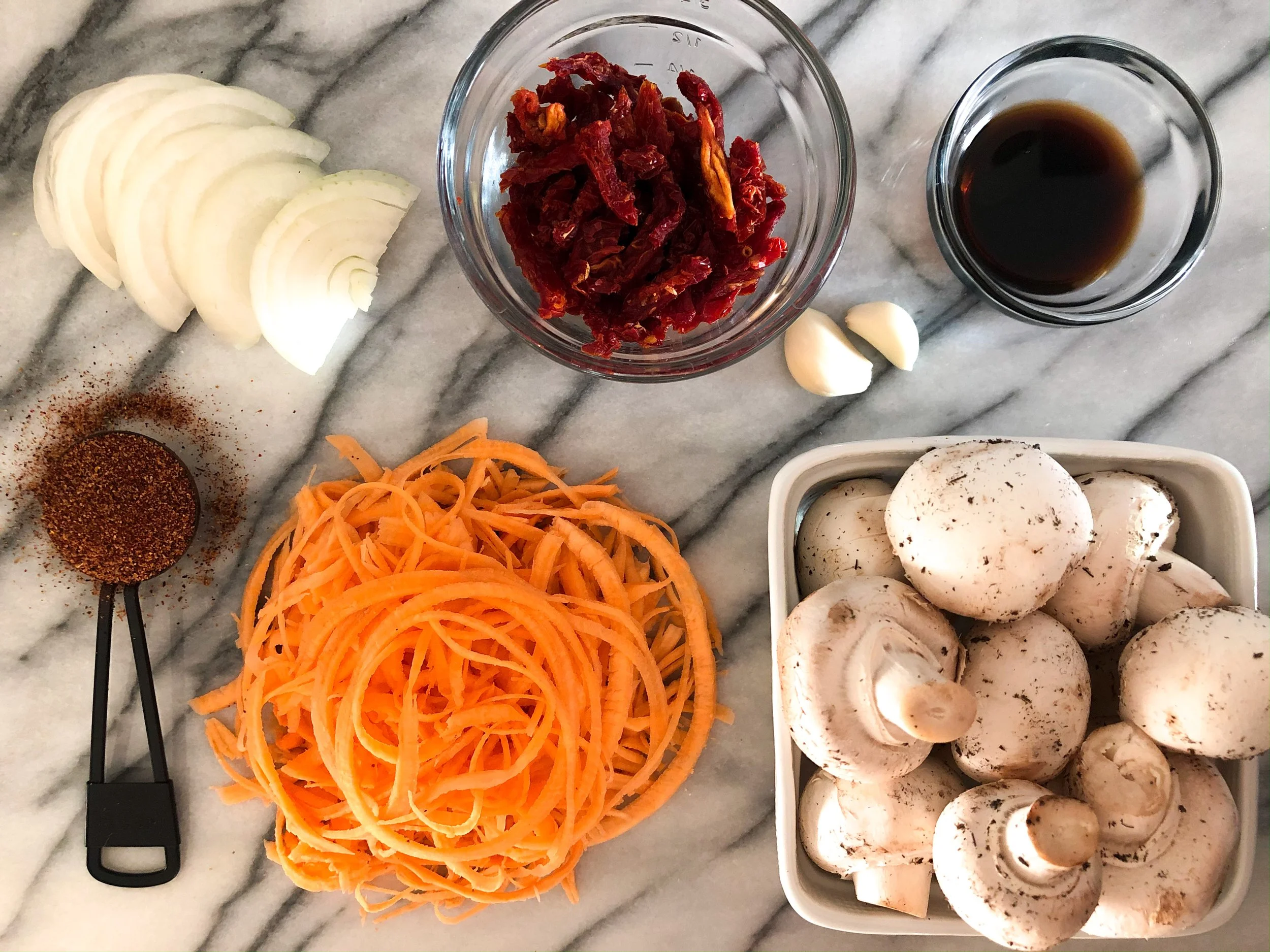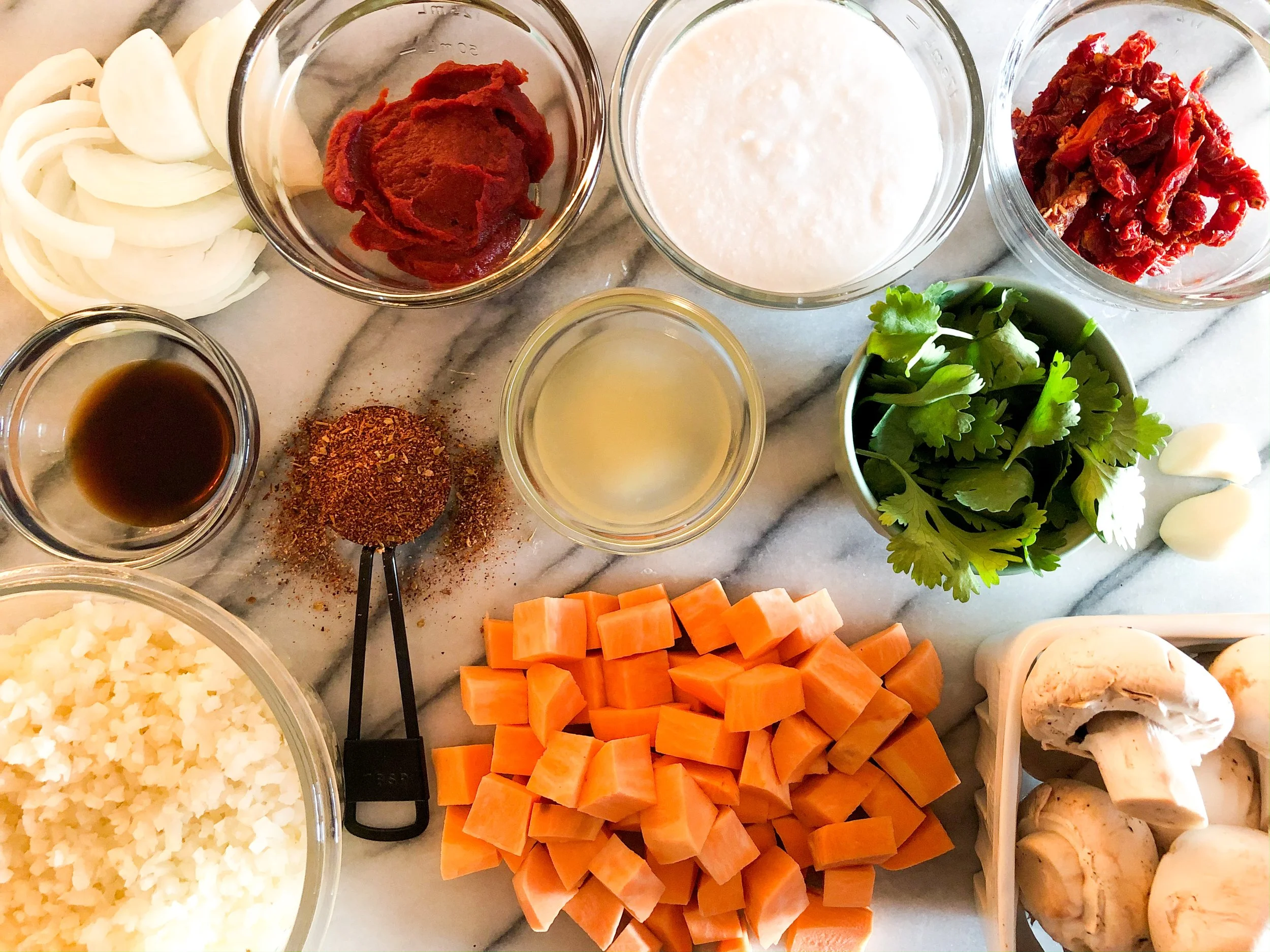 Combine water, sweet potatoes, onion, garlic, tomato paste, sun-dried tomatoes, riced cauliflower, and mushrooms in a pot. Bring pot to boil.