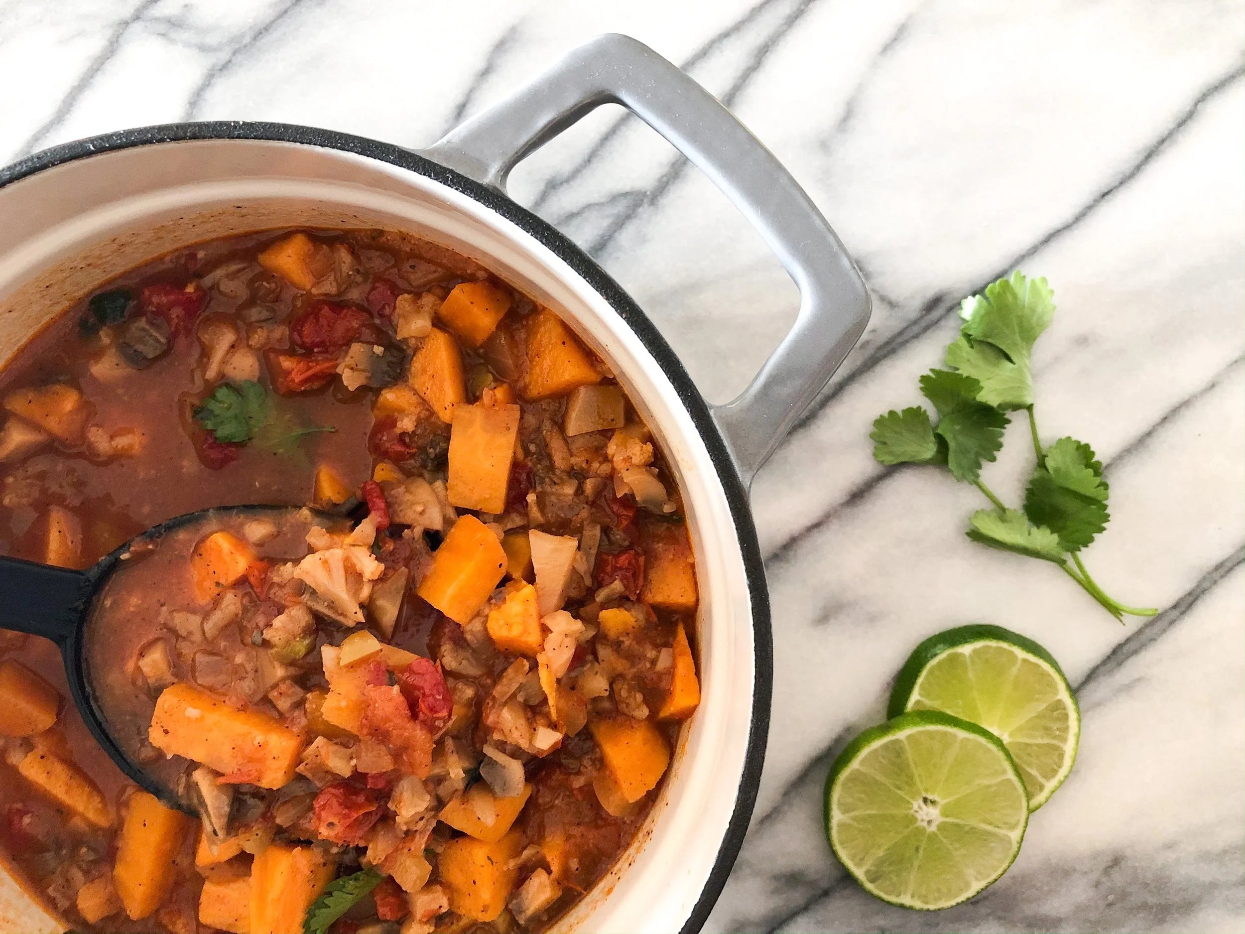 Add Mexican seasoning, coconut aminos, and coconut cream. Simmer for 30 minutes or until sweet potatoes are soft.