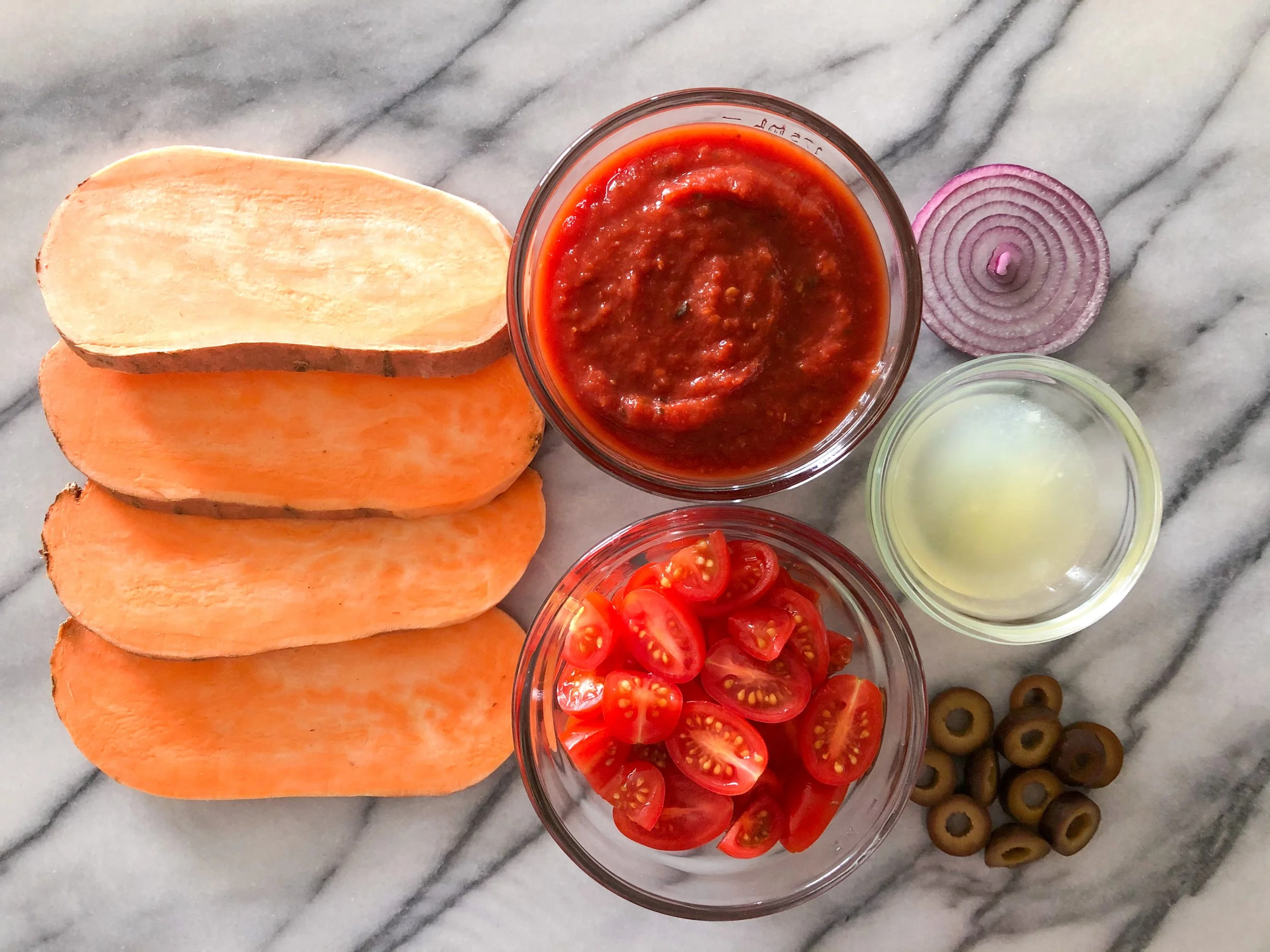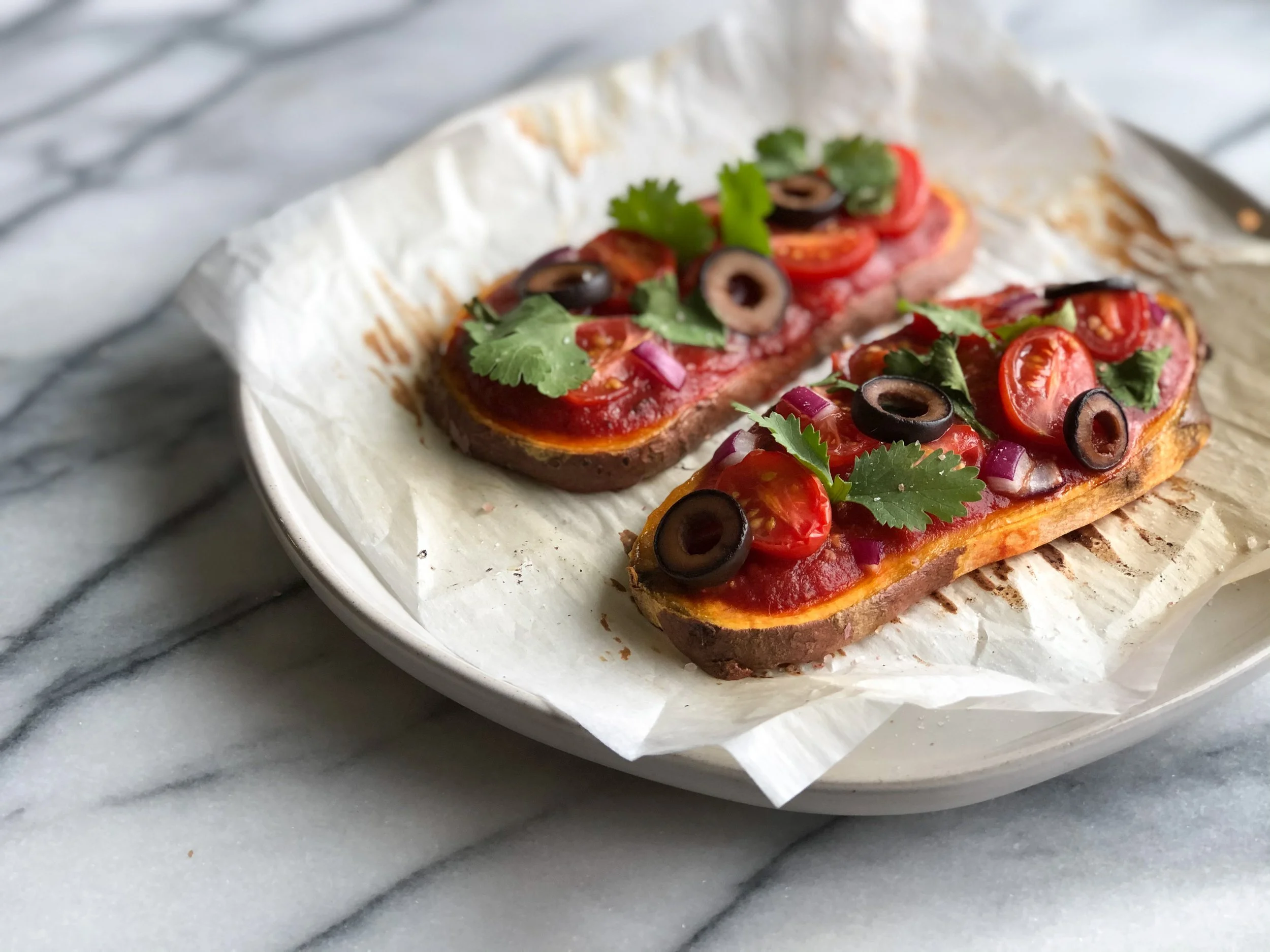 Top sweet potatoes with marinara sauce, diced tomatoes, and any additional toppings.