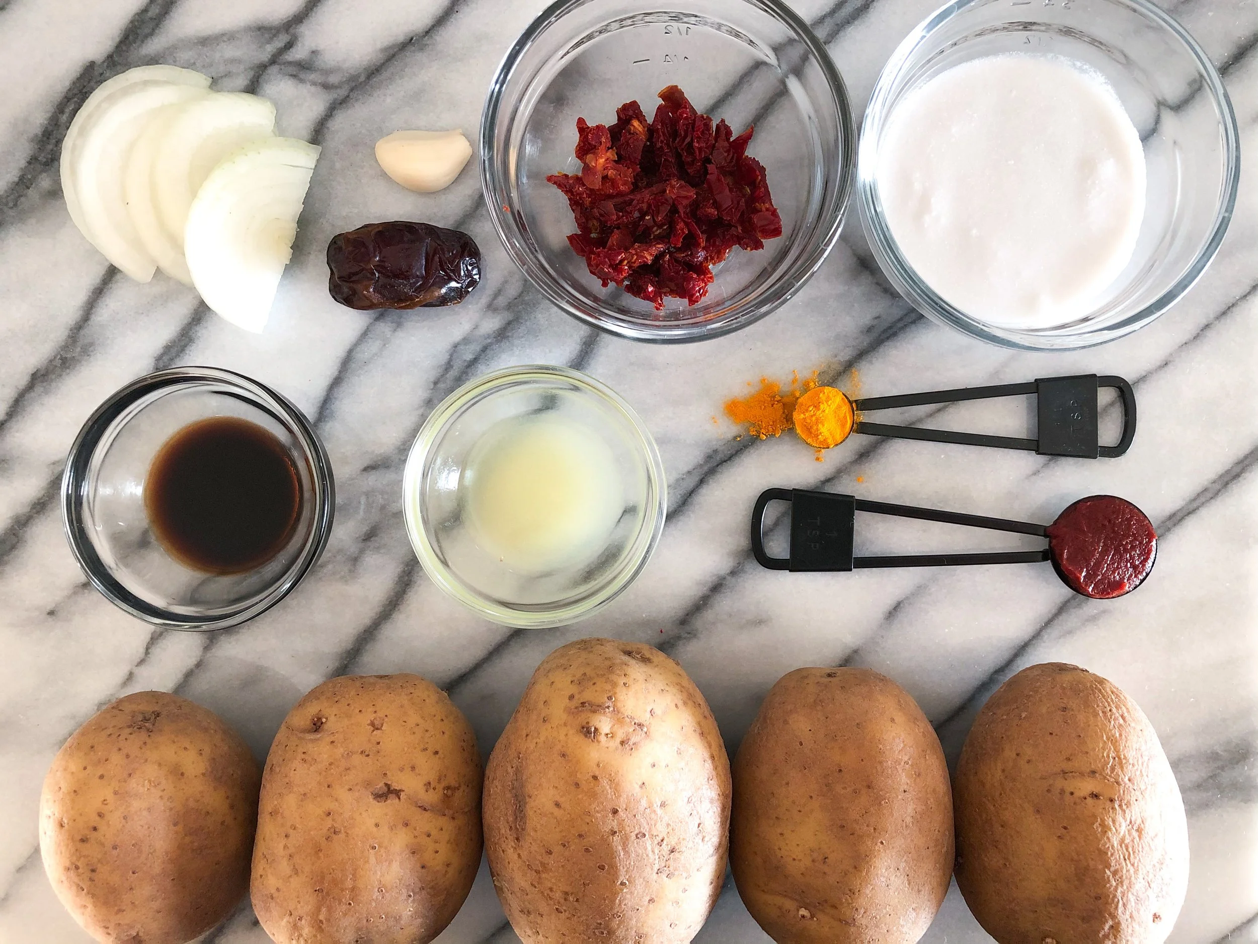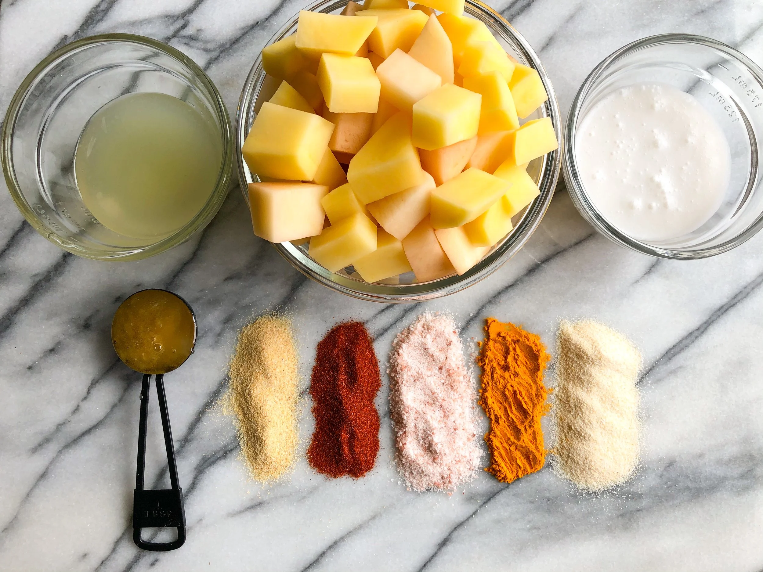 Combine cooked potatoes, water, and the rest of the ingredients in a blender.