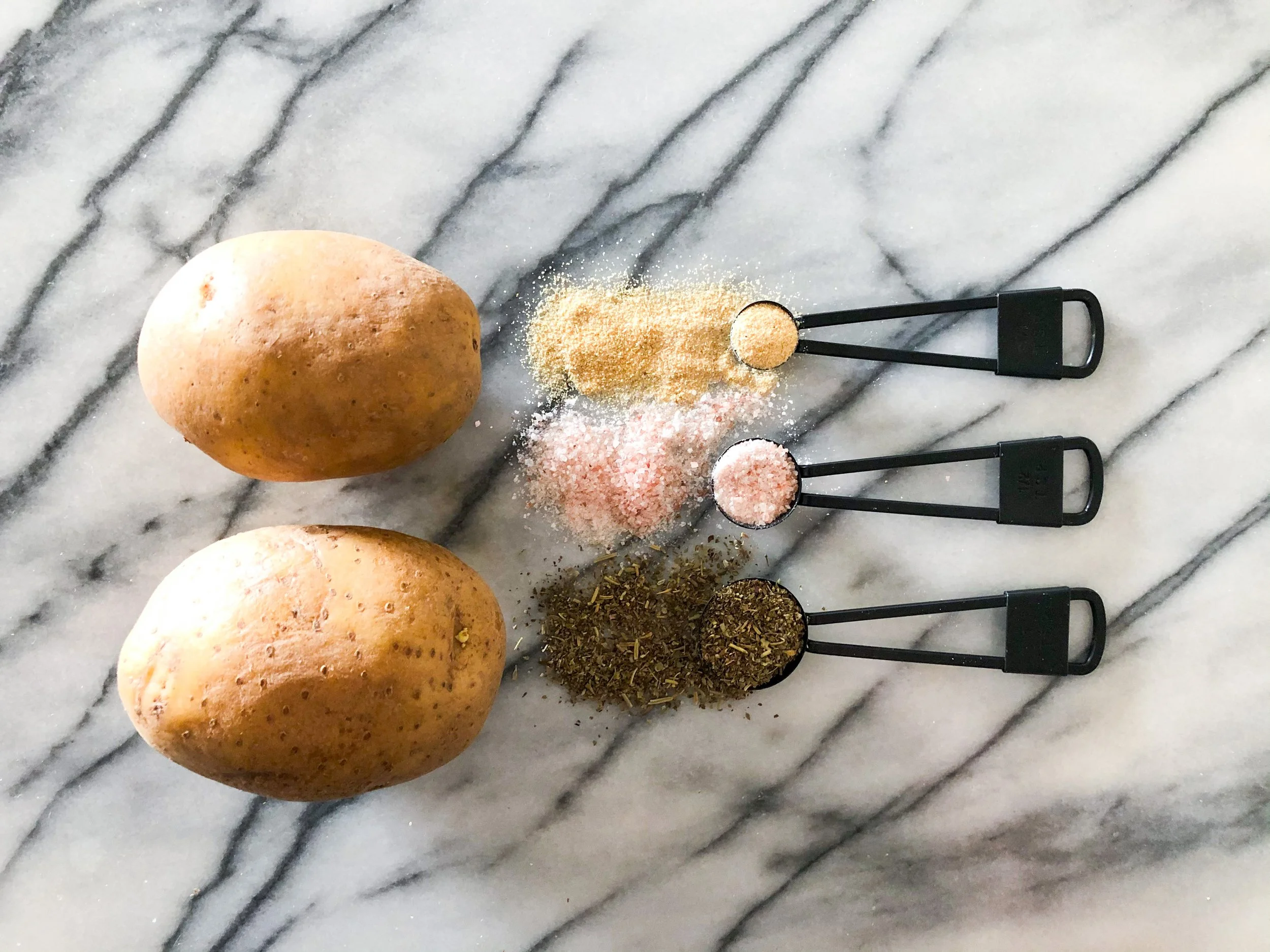 Place potato slices on a baking sheet. Sprinkle with garlic powder, salt, and Italian seasoning.